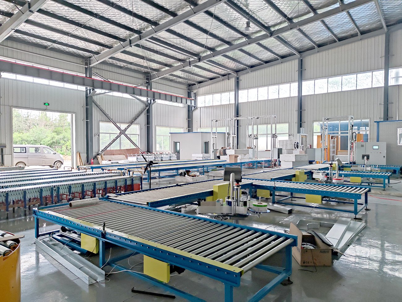 該條線體主要實現(xiàn)對聚氨酯泡沫板實現(xiàn)整理、計數(shù)、貼標(biāo)、打碼、翻轉(zhuǎn)、碼垛、輸送以及捆扎作業(yè),整線由PLC控制,實現(xiàn)無人化操作,也可以接駁在線纏繞包裝以及在線覆頂膜設(shè)備,實現(xiàn)對物料的全方位包裝。